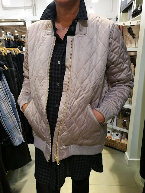 Lauantaina tepastelin Pukumieheen, satuin juuri sopivasti kun eräs nainen sovitteli Minimumin utuisen vaaleanpunaista,(aavistuksen siniseen taittava), bomberia päällensä! Nopeaa toimintaa, ja sain näpsittyä muutaman kuvan. Tämä kyseinen malli, on minusta suunnattu aikuiselle naiselle. Se on pidempi, joka menee monelle, toki ei ehkä hirmu lyhyt selkäiselle. Sävy on kaunis, ja ihanat kultaiset vetoketjut, viimeistelevät takin. Hintaa takilla oli 110€, jos en kovin väärin muista. Itse kun olen kaulahuivi ihmisiä, mietein että minkälaisen huivin käärisin kaulaan, nyt ehkä poikkeuksellisesti laittaisin saman värisen, toki pieni sävyero olis jees! Tämä sävy on jotenkin niin puhdas ja kaunis!